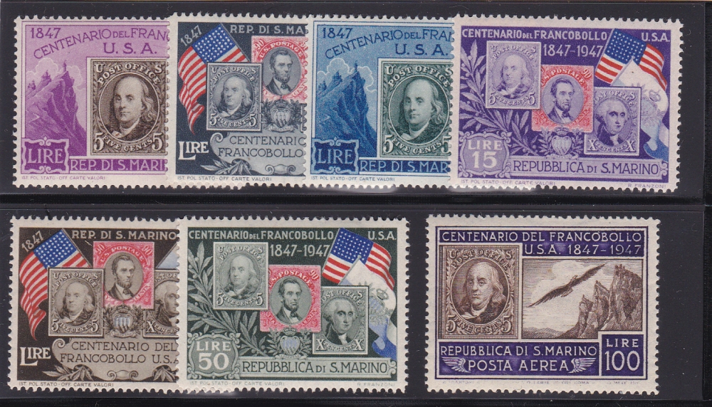 serie completa 6 valori + 1 valore P.A. "Centenario primo francobollo degli Stati Uniti" gomma integra cat Sassone n.330/35 + P.A. 75 €. 35.00